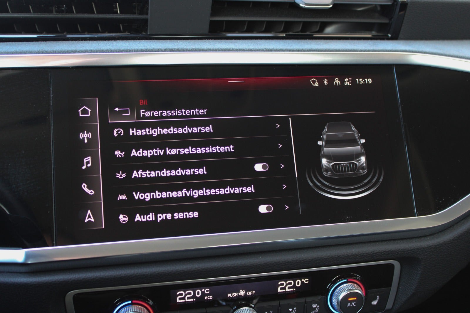 Audi Drive Select, kø assistent, auto hold, sædevarme, emergency assist, glanspakke m. blank tagræling og blanke rudelister, assistentpakke, læder sportsrat m. multifunktion, digitalt cockpit, el-sidespejle m/varme, 6-trins aut.gear, front assist inkl. City ANB, prestige selection, pro selection, DAB-radio, connectivity pakke, connect pakke, aut. nedbl. bakspejl, regnsensor, frakobling af passagerairbag, el-justerbar lændestøtte, isofix, kørecomputer, højdejust. førersæde, splitbagsæde, LED-kørelys, fjernb. centrallås, 4x el-ruder, udv. temp. måler, elektrisk parkeringsbremse, app integration, håndfrit til mobil, musikstreaming via bluetooth, usb-c tilslutning, dæktryksmåler, automatisk lys, automatisk nødbremsesystem.